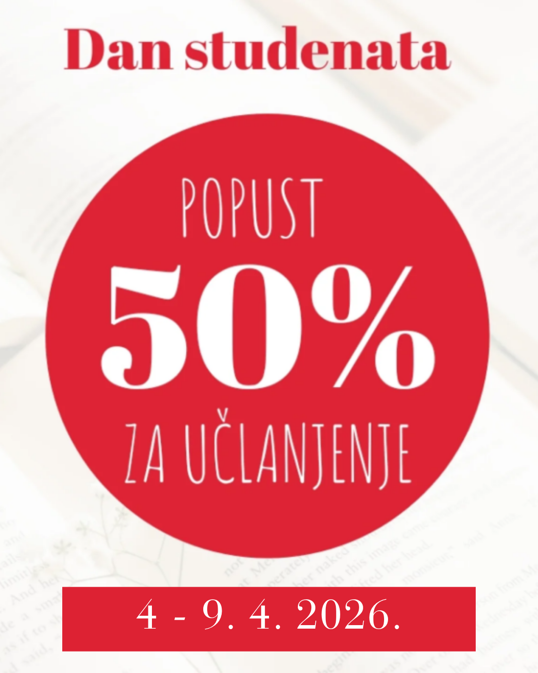 У част обележавања Дана студената, Универзитетска библиотека „Светозар Марковић“ свим студентима нуди повлашћен упис са 50% попуста, од 4. до 9. априла 2026. године