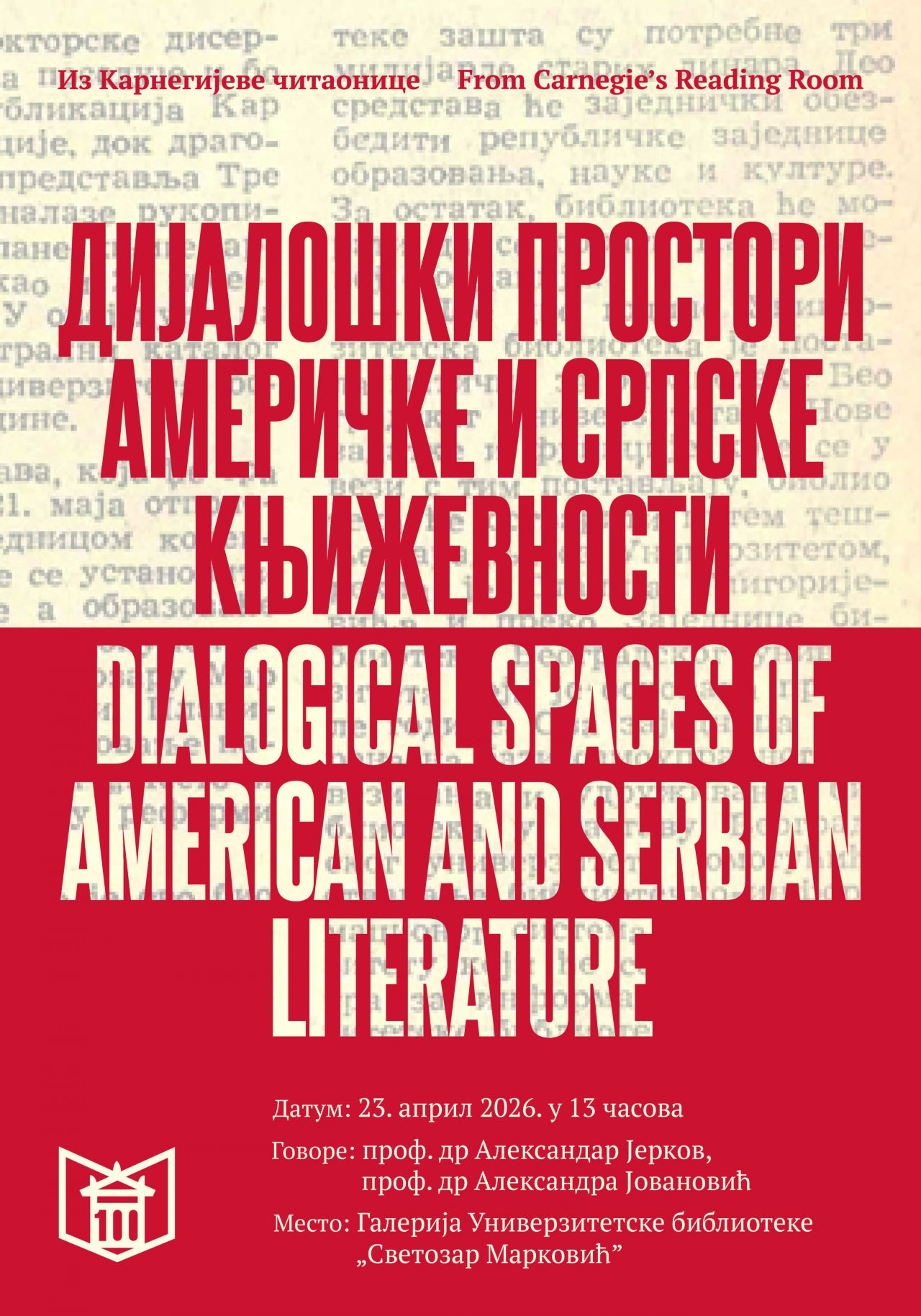 У четвртак, 23. априла 2026. године са почетком у 13 часова биће отворена изложба „Дијалошки простори америчке и српске књижевности“. На отварању ће говорити директор Библиотеке, проф. др Александар Јерков, као и проф. др Александра Јовановић.